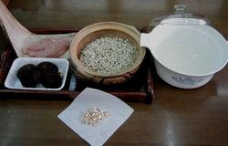 除きます。そこに水に浸しておいたハトムギと適量の水洗いしたご飯を加え